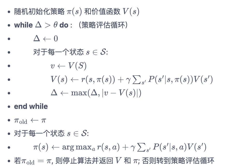 该过程称为策略提升。当提升后的策略\(\pi'\)和之前的策略\(\pi\)相同时,策略迭代收敛,此时的\(\pi\)是最优策略。