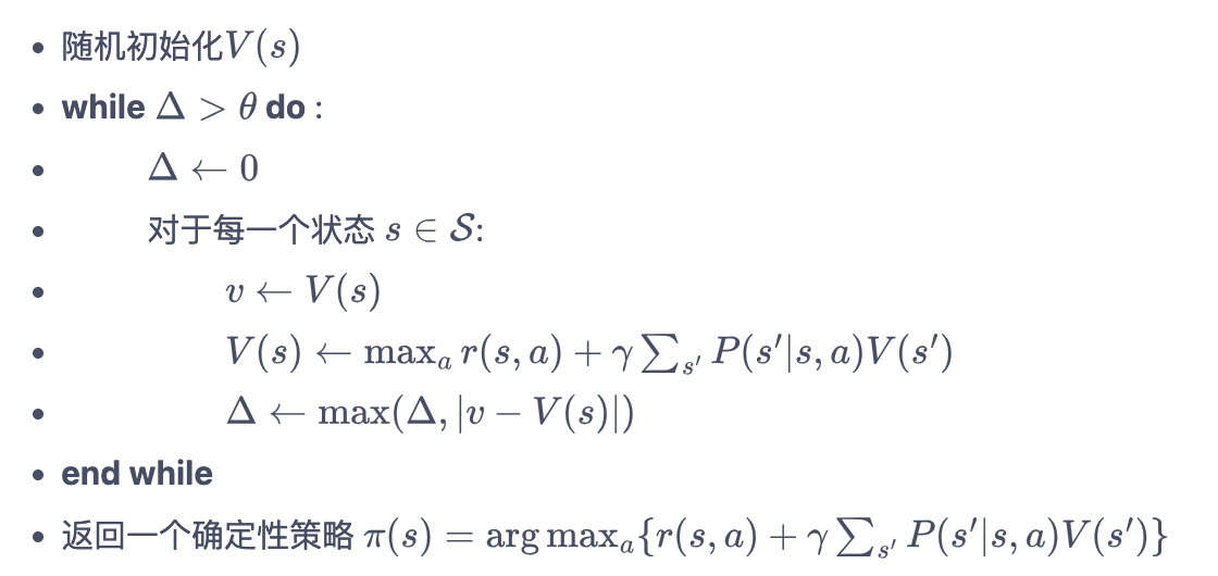 当\(V^k\)与\(V^{k+1}\)趋同时,其为贝尔曼最优方程的不动点,此时对应最优状态价值函数\(V^*\);利用\(\pi(s)=\argmax_{a}[R(s, a)+\gamma\sum_{s'\in S}p(s'|s, a)V^{k+1}(s')]\)恢复出最优策略。