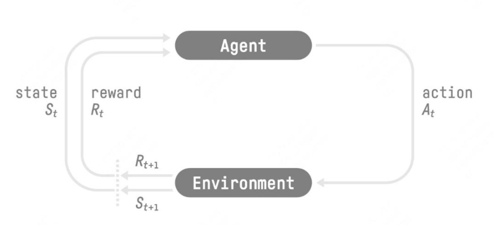 强化学习的理念:Agent 根据 Environment 输出的 \(S_t\) 和 \(R_t\) 综合判断,产生当前步骤的动作 \(A_t\),放入 Environment 执行;Environment 根据 \(A_t\) 执行的结果,输出下一个状态 \(S_{t+1}\) 和当前动作带来的奖励 \(R_{t+1}\),返回给 Agent。