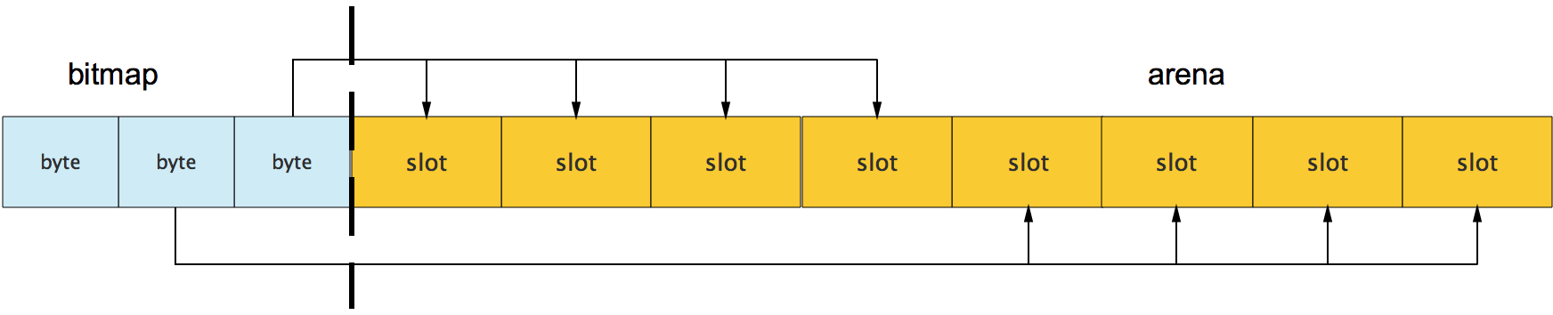 bitmap如下: bitmap中一个byte对应4个指针(指针大小为8bit)的内存;bitmap的高地址部分指向arena的低地址部分;
