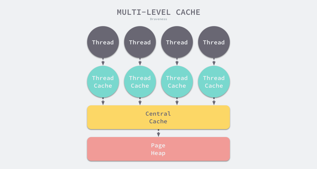微对象:(0, 16B) 小对象:[16B, 32KB] 大对象:(32KB, +∞) 多级缓存包括3个组件:线程缓存(Thread Cache)、中心缓存(Central Cache)和页堆(Page Heap)