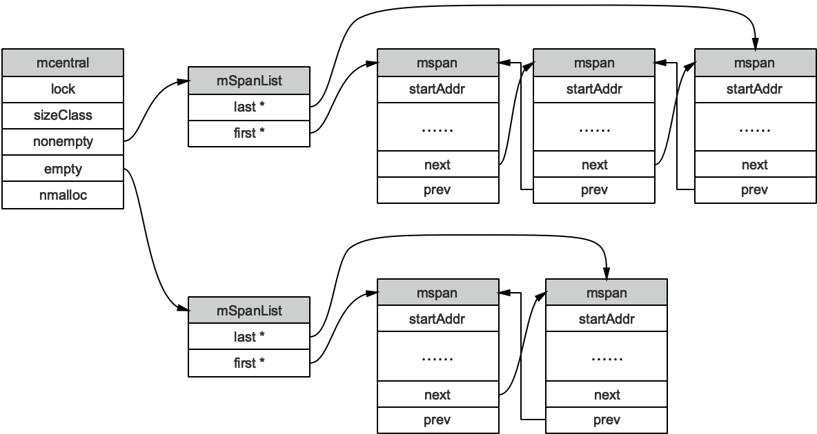 若干个runtime.mspan组成双向链表;每个runtime.mspan 管理npages个大小为8KB的页 (这里的页是操作系统内存页的整数倍)
