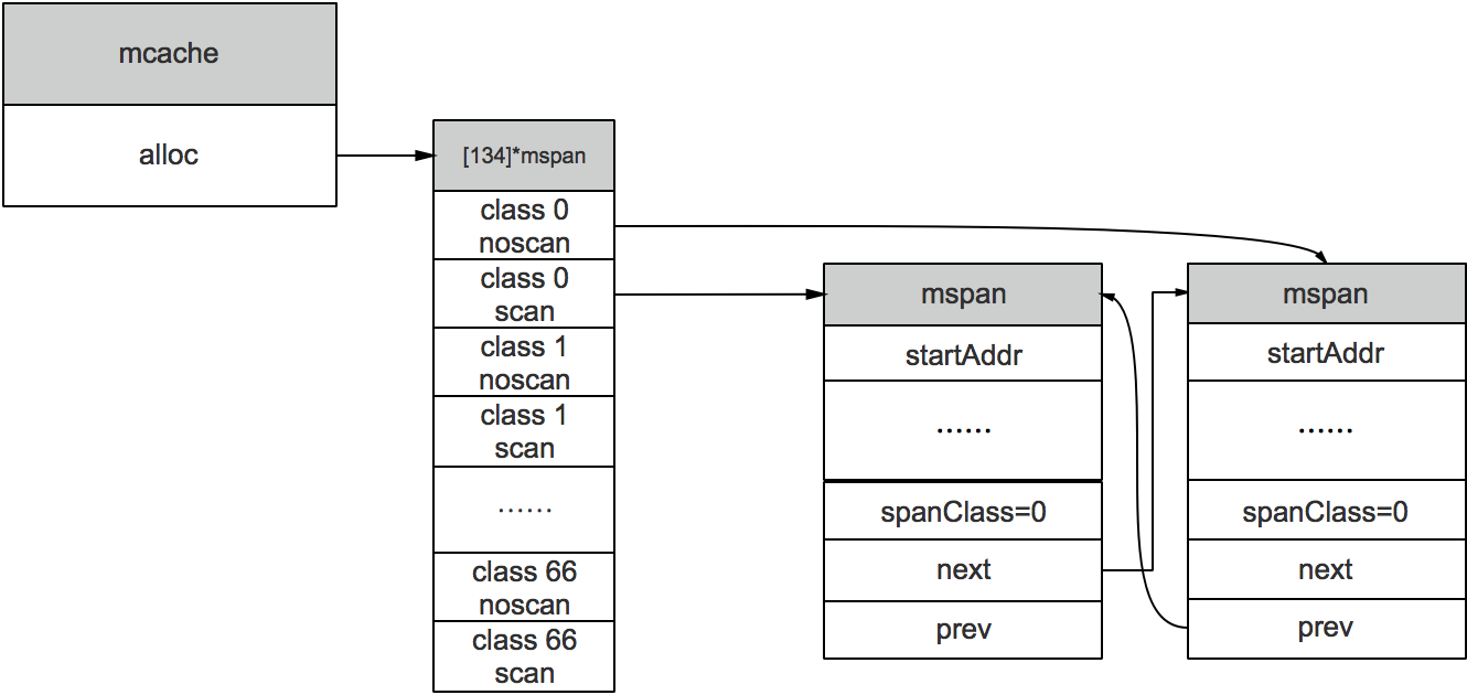 1 2 3 4 5 6 7 8 9 type mcache struct { tiny uintptr tinyoffset uintptr local_tinyallocs uintptr ... alloc [numSpanClasses]*mspan } numSpanClasses = _NumSizeClasses << 1