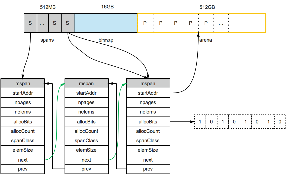 1 2 3 4 5 6 7 8 9 10 11 12 13 14 15 16 17 18 19 20 21 22 23 24 type mspan struct { next *mspan prev *mspan list *mSpanList ... startAddr uintptr npages uintptr freeindex uintptr allocBits *gcBits gcmarkBits *gcBits allocCache uint64 ... state mSpanStateBox spanclass spanClass }