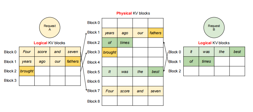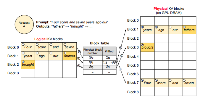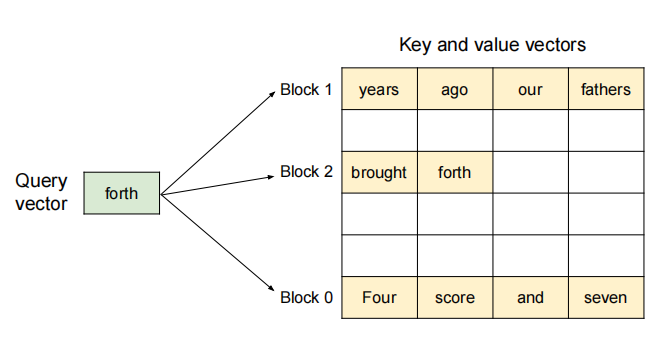 在注意力计算过程中,PagedAttention内核会动态识别、并分别获取不同的KV块。如图所示,键值向量分散存储在三个非连续物理内存块中(例如块0存储"Four score and seven"的键值向量)。
