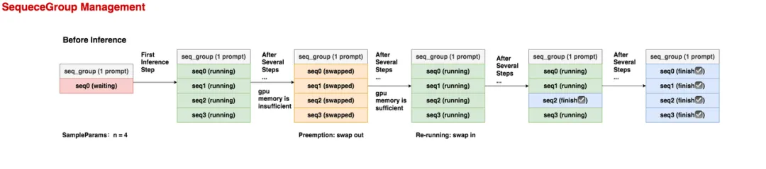 做decode时,给每个seq分配1个token的位置;那么running队列中,seq_group下的n个seqs在上1个推理阶段共生成了n个token。本次调度中,先为这n个token分配物理空间,存放其在本次调度中即将产生的KV值。