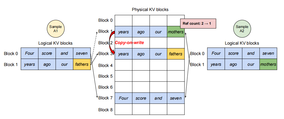 - prompt阶段:双输出样本共享相同的prompt,因此只保留一份prompt状态的拷贝;两个序列的prompts对应逻辑块,映射至相同的物理块。