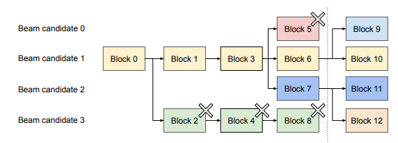 - 择优保留:筛选概率最高的\(k\)个序列,进入下一轮迭代。