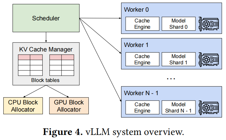 - GPU工作节点:块引擎(block engine)分配连续GPU显存,并划分为物理KV块;